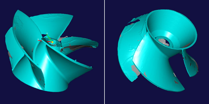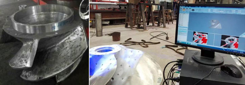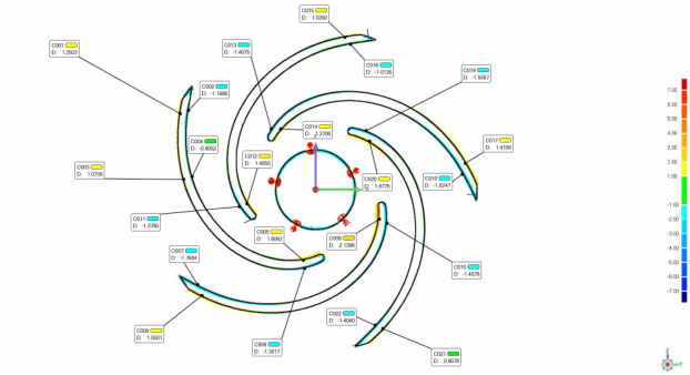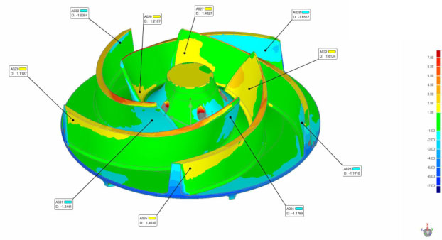 客戶根據(jù)逆向圖紙進(jìn)行設(shè)計(jì)確認(rèn),補(bǔ)充公差標(biāo)準(zhǔn)、工藝要求等后,進(jìn)行加工制造。對(duì)加工得到的葉輪樣品再進(jìn)行掃描,掃描數(shù)據(jù)與設(shè)計(jì)3D進(jìn)行對(duì)比,檢測(cè)加工是否合格。